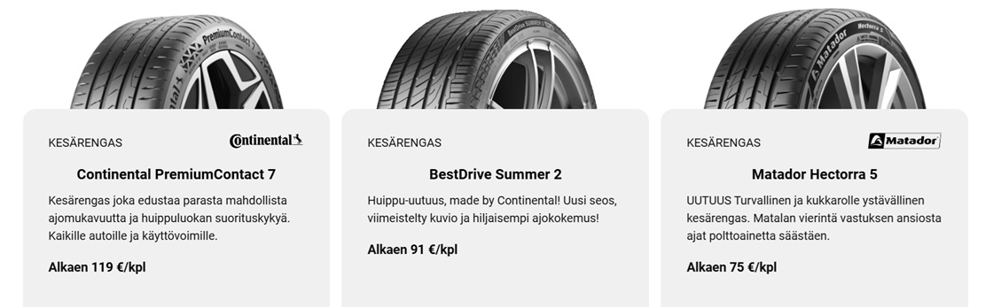 Kesärenkaiden valintaopas 2026 Kun on aika hankkia uudet kesärenkaat, vaihtoehtojen kirjo voi tuntua päätähuimaavalta. Me Tampereen BestDrivella haluamme helpottaa valintaasi ja olemme poimineet valikoimaamme parhaat kesärenkaat...